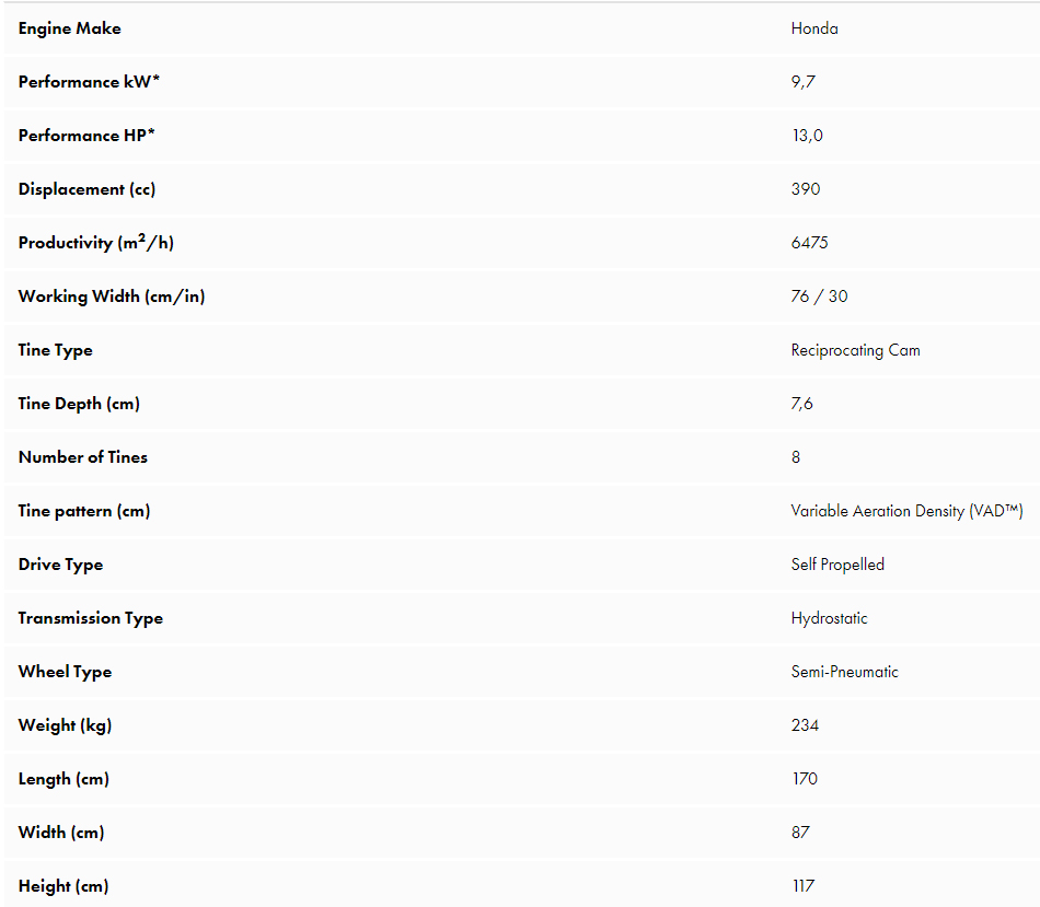 This machine combines a width of 76 cm and a speed of up to 6.9 km / h, which allows the aeration of 1600 m2 in just 15 minutes. In addition, it is no longer necessary to lift the pins when turning. FLEXTECH ™ arms provide up to twice the depth of the plugs than drum aerators. The In-Ground Turning function provides unmatched maneuverability, ergonomics and ease of use. A huge reserve of power is guaranteed by the Japanese Honda GX390 drive unit with a power of approx. 12 horsepower, with a forged and bearing-mounted crankshaft and digital ignition. The industrial class starter always guarantees efficient and failure-free starting, and the cast-iron cylinder liner is highly resistant to heavy loads and high operating temperatures. The use of a smooth adjustment of the plug density allows to obtain 2 to 10 times more plugs in a single pass than in the case of drum models (from 8 to 48 holes per square meter). This solution eliminates the need for double aeration and enables quick and effective preparation of the lawn for sowing.
