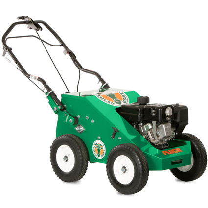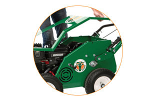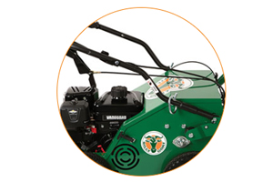 This compact, reciprocating aerator with a working width of 46 cm is ideal for the aeration of smaller lawns. Equipped with 4 easily replaceable pins (empty or full), mounted on arms that work like a piston connecting rod, effectively puncturing even harder surfaces. The device can aerate up to 2,000 m2 per hour and is easy to use. The aerator does not require additional weights. The foldable handle allows for compact transport and storage. The lack of chains and the cover removable without the use of tools facilitate maintenance. 12-inch polyurethane transport wheels sit outside the working width. Powered by renowned Vanguard ™ or Honda engines. Cast iron piston connecting rod ensures precise and effective aeration. The density of the plugs can be adjusted by the machine advance speed (the slower the machine moves, the denser the plugs are, the faster the feed translates into less frequent distribution of the plugs).