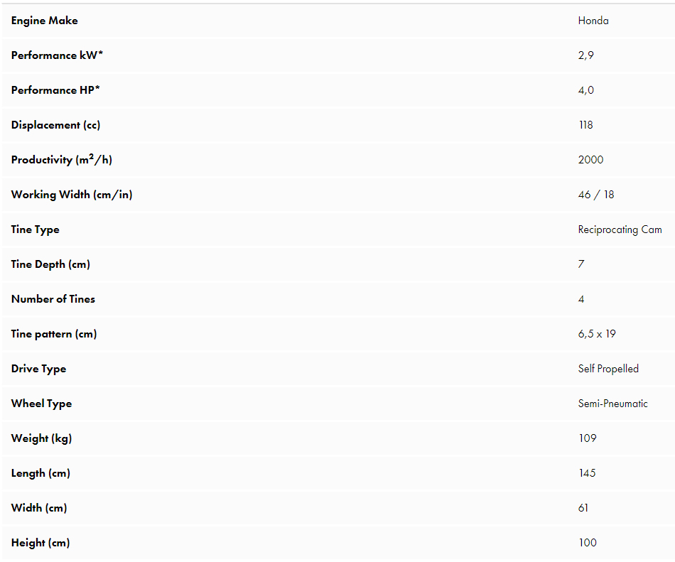 This compact aerator with a working width of 46 cm is ideal for aerating smaller objects or renting to companies. The machine is equipped with high-performance connecting rod pins that propel the unit forward. The device can aerate up to 2,000 m2 per hour and is easy to use and control. The aerator does not require additional weights. The foldable handle allows for compact transport and storage. Four prongs and no chains, plus a tool-free removable cover for easy maintenance. Powered by the renowned Honda engine.